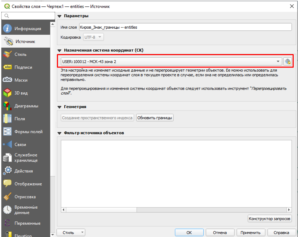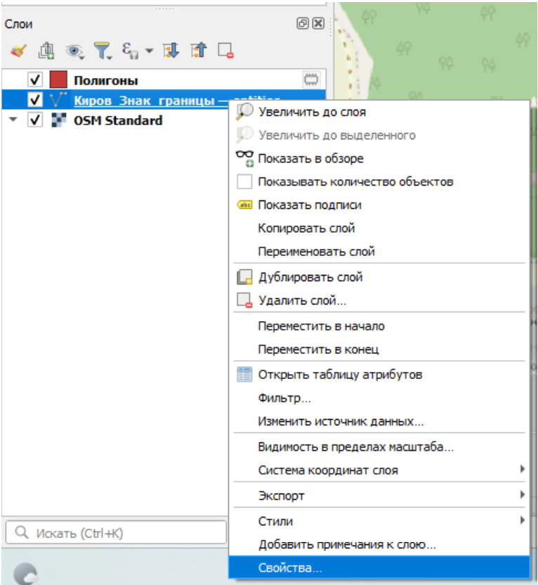 3. Назначить импортированному dxf-файлу систему координат проекта – пользовательскую МСК для региона проектирования (см. памятку «Создание местной системы координат (МСК) в QGIS»). Для этого кликнуть правой кнопкой по импортированному слою -> «Свойства».
