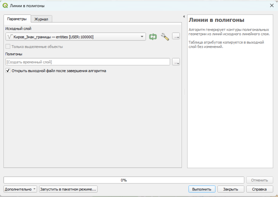 В открывшемся окне выбрать необходимый исходный слой (Границы) и нажать «Выполнить». Полигон создан, закрыть окно.
