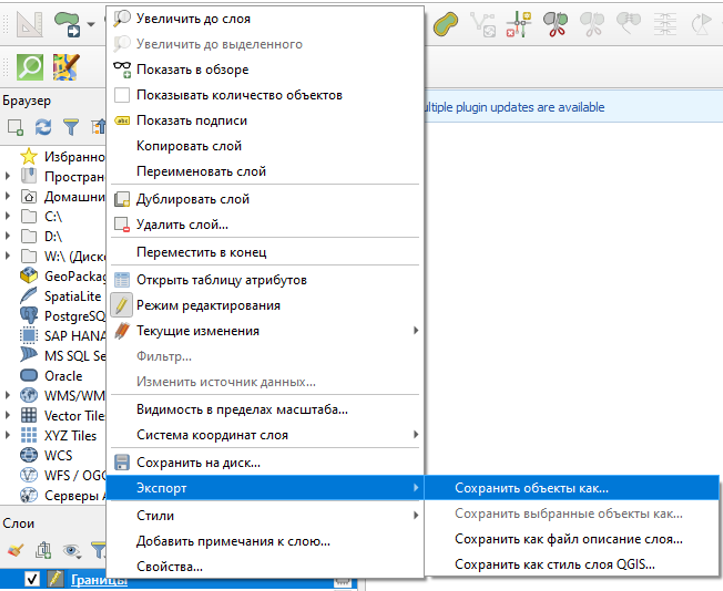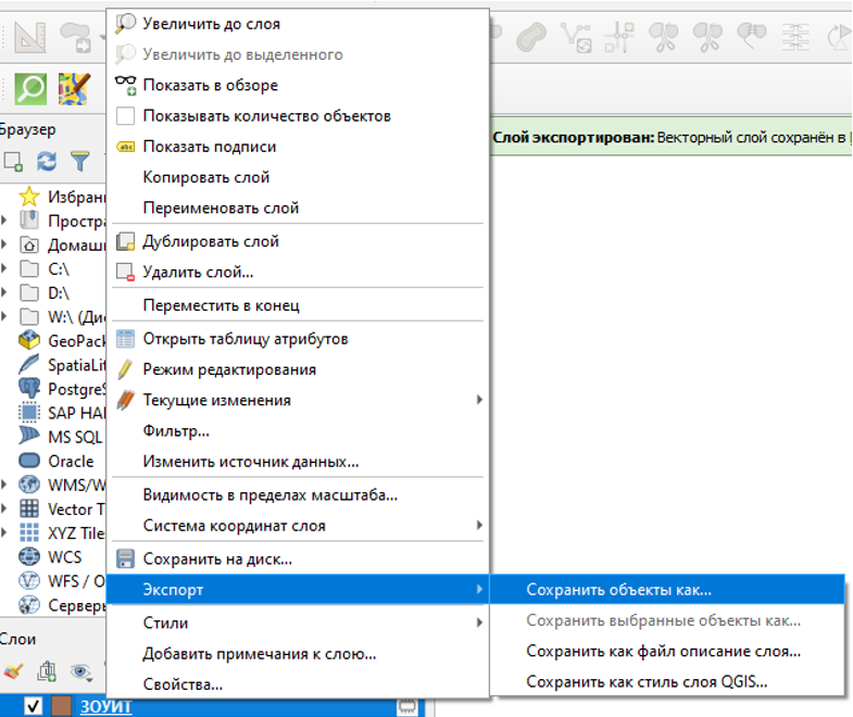 5. Сохранить слой с полигонами ЗОУИТ в GeoJSON-файл. Для этого кликнуть правой кнопкой по слою в диспетчере слоев -> «Экспорт» -> «Сохранить объекты как». В открывшемся окне назначить систему координат «EPSG: 4326 - WGS-84». Назначить папку сохранения и нажать «Ок».