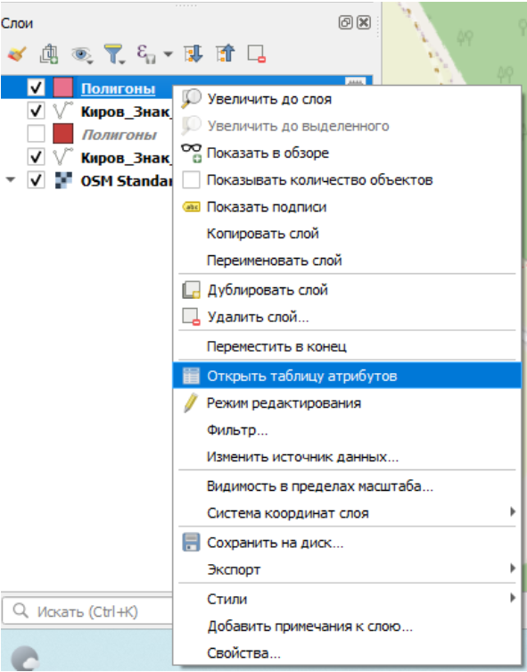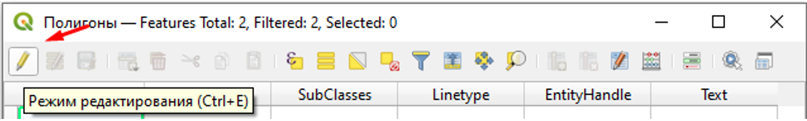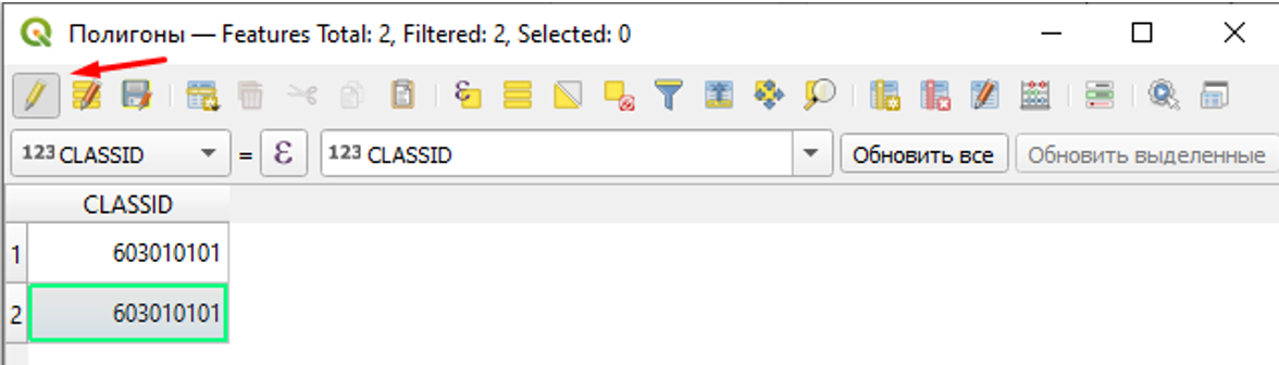 2. Открыть таблицу атрибутов временного слоя (полигона ЗОУИТ), полученного после перевода линий в полигон. Запустить режим редактирования (иконка