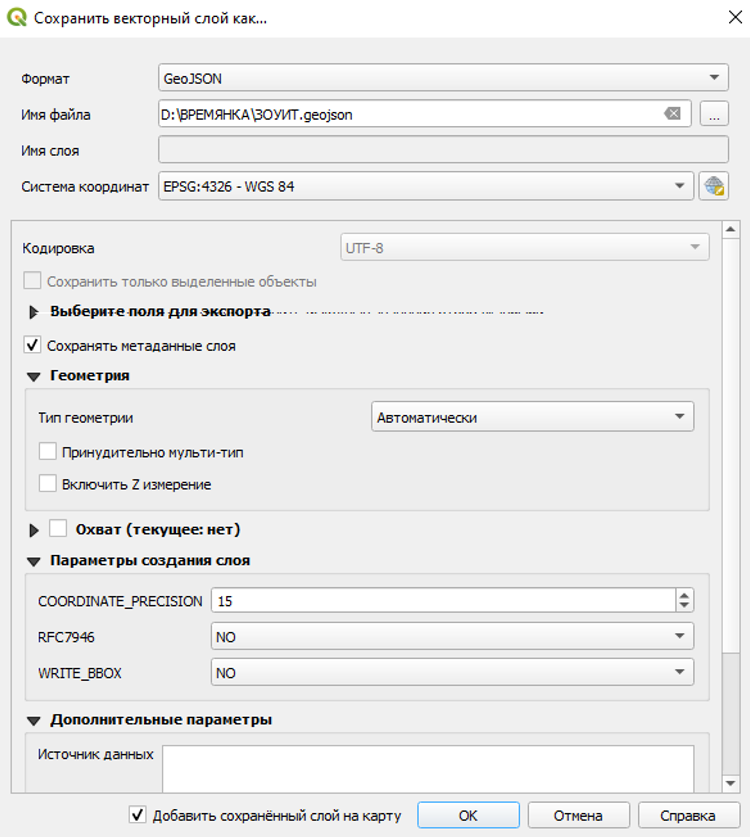 5. Сохранить слой с каркасом УДС в GeoJSON-файл. Для этого кликнуть правой кнопкой по слою в диспетчере слоев -> «Экспорт» -> «Сохранить объекты как». В открывшемся окне назначить систему координат «EPSG: 4326 - WGS-84». Назначить папку сохранения и нажать «Ок».