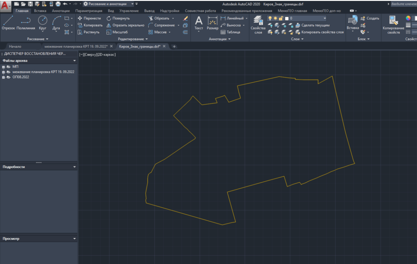 1. Сохранить геометрию границ территории в формате dxf. Для этого выделить границы территории в исходном файле AutoCad -> скопировать в буфер обмена -> создать новый файл AutoCad и вставить в него границы с исходными координатами -> сохранить как файл dxf.