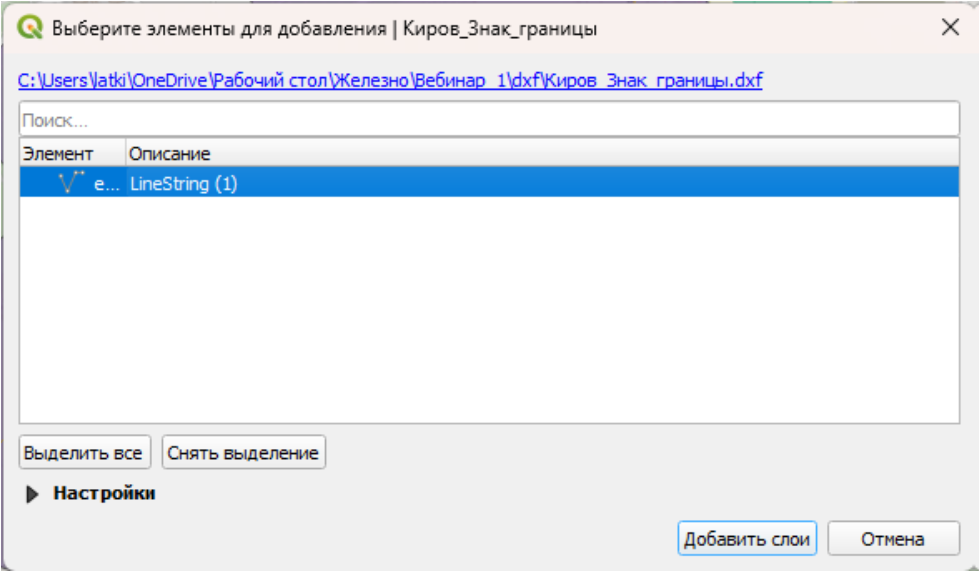 2. Импортировать dxf-файл с границами территории в окно QGIS простым перетягиванием из папки. В появившемся окне нажать «Добавить слои».