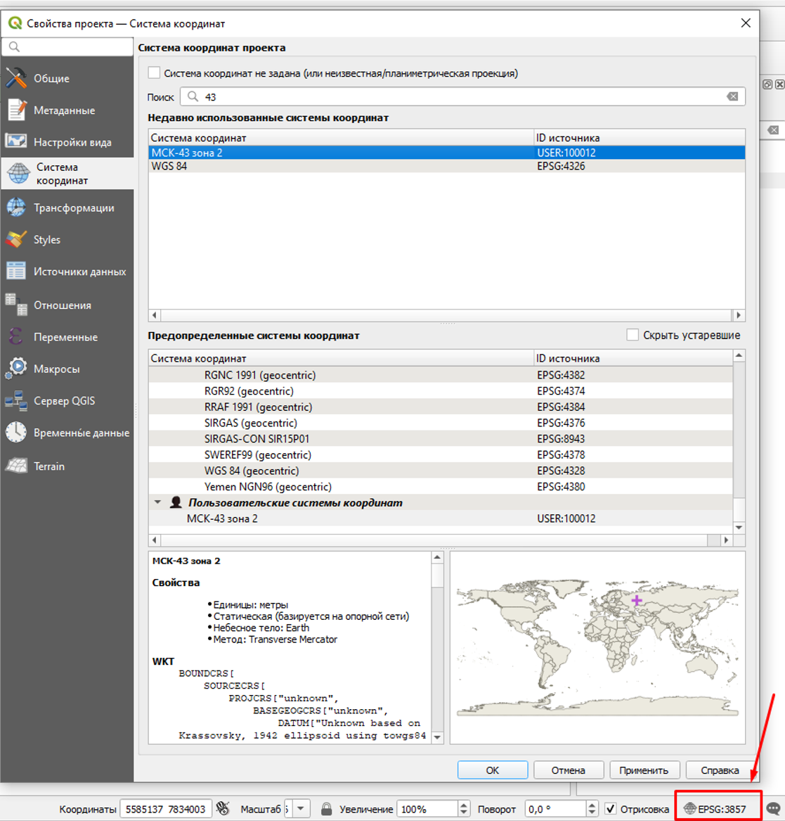 Назначить проекту QGIS необходимую для проекта МСК (в нижнем правом углу на панели).