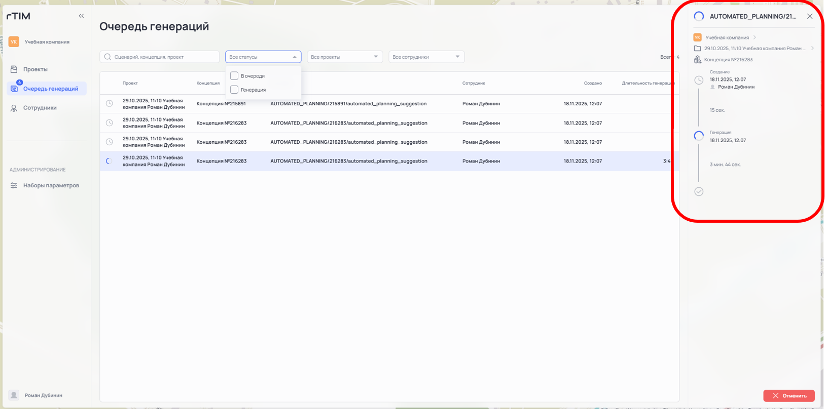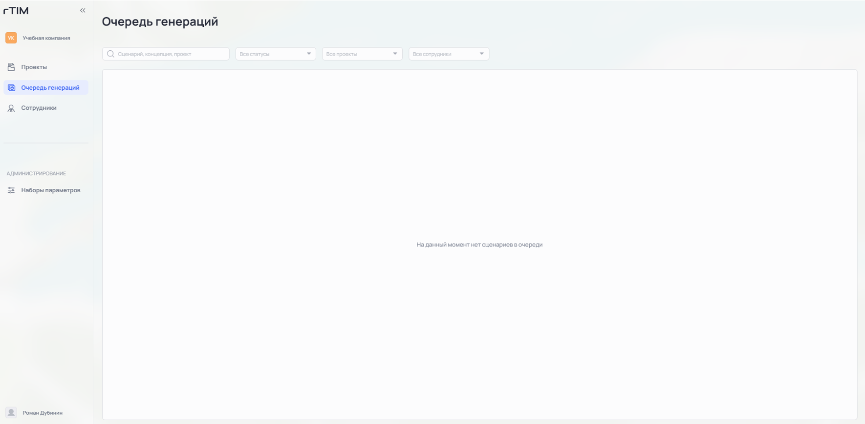 В таблице «Очередь генераций» отображается информация о Проекте, Концепции, названии Сценария, запустившем её Сотруднике, дате и времени запуска Генерации и её длительности.
