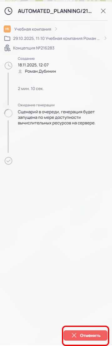 Обратите внимание, что после отмены генерации её невозможно будет возобновить позже. Процесс генерации при этом перейдёт к следующему в «Очереди генераций» сценарию.